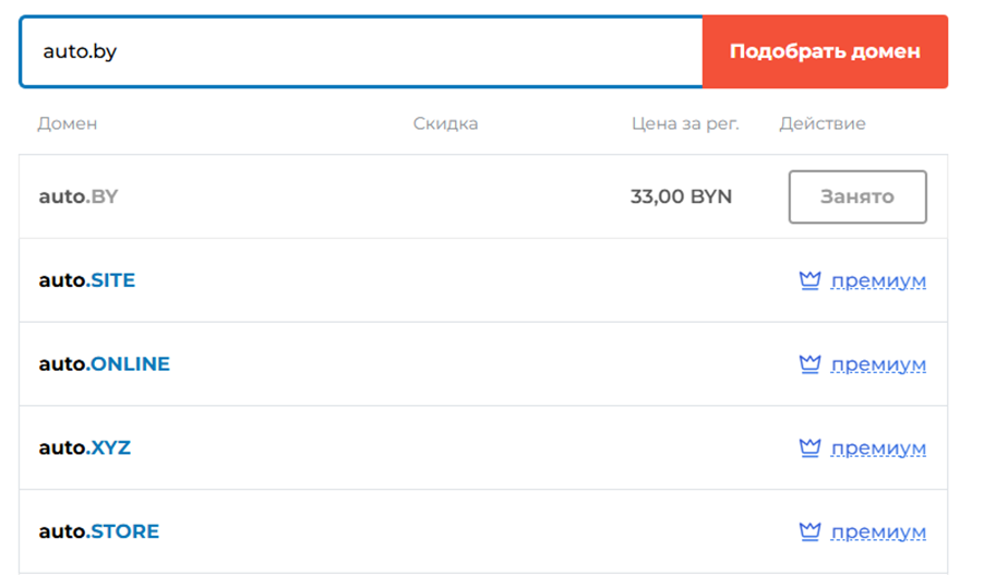 Пока бизнес ищет свободные домены на латинице, в кириллической зоне остаются варианты, которые можно купить по обычной цене — 33 BYN в год. Для сравнения: домен с латинским словом auto — премиальный и стоит в несколько раз дороже.