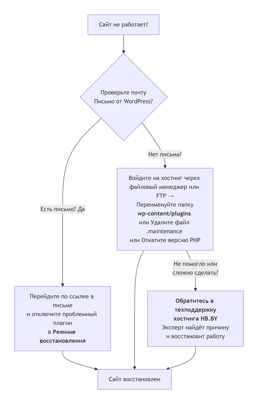WordPress с версии 5.2 включает режим восстановления. Когда WordPress обнаруживает критическую ошибку, он отправляет администратору письмо на электронную почту. В нём указывается точное имя плагина и файл ошибки, а также даётся ссылка для входа в безопасный режим, где можно отключить проблемное расширение: