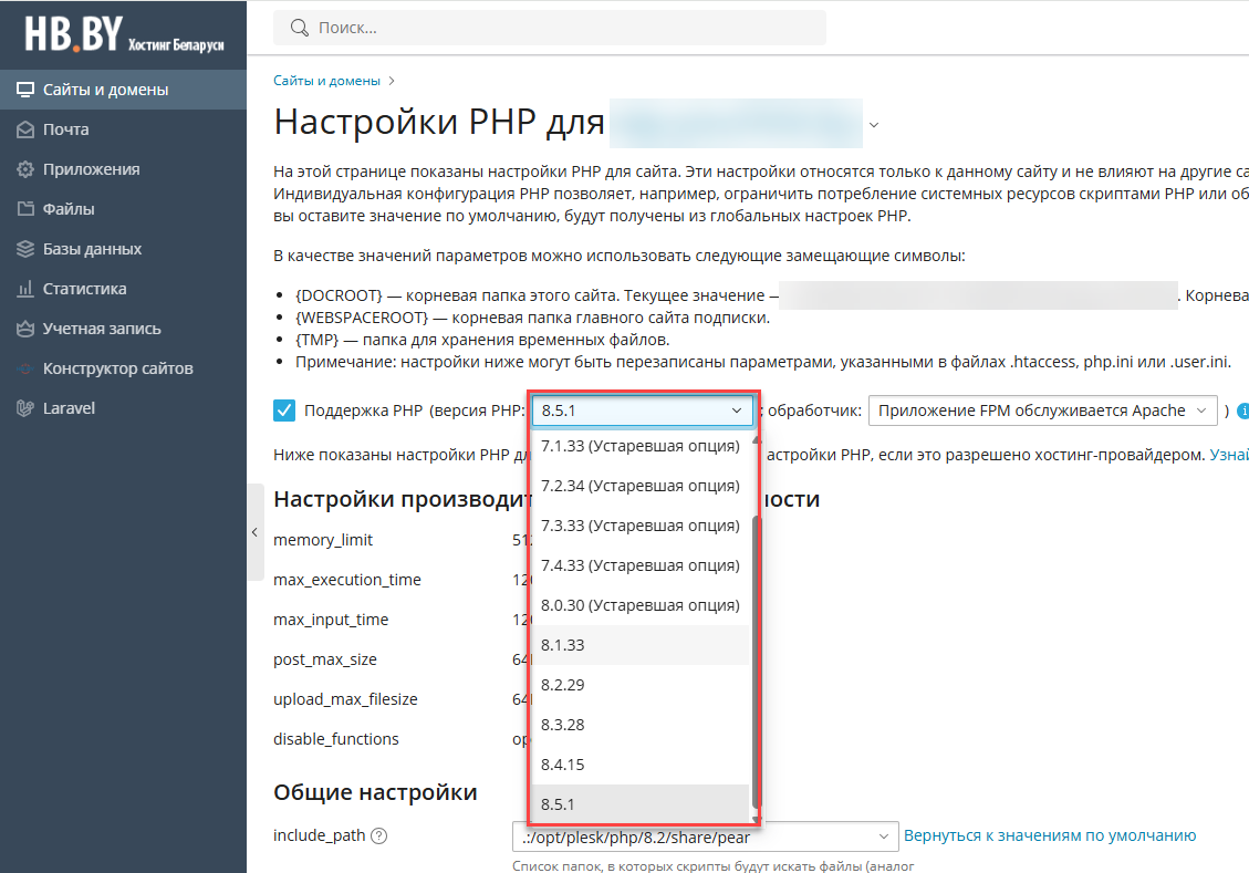 - В панели управления хостингом найдите раздел настройки PHP (часто называется MultiPHP Manager, Выбор версии PHP).