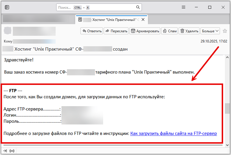 После этого откройте письмо от HB.BY, которое вы получили при заказе хостинга. В нём указаны ссылка и параметры FTP-сервера.