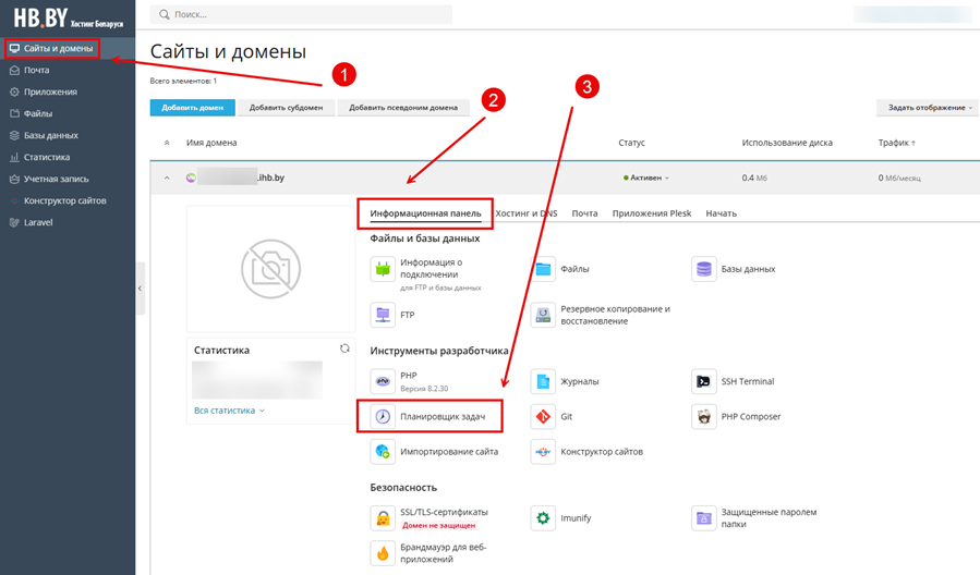 Войдите в панель управления Plesk. На странице Сайты и домены перейдите в раздел Информационная панель → Планировщик задач.