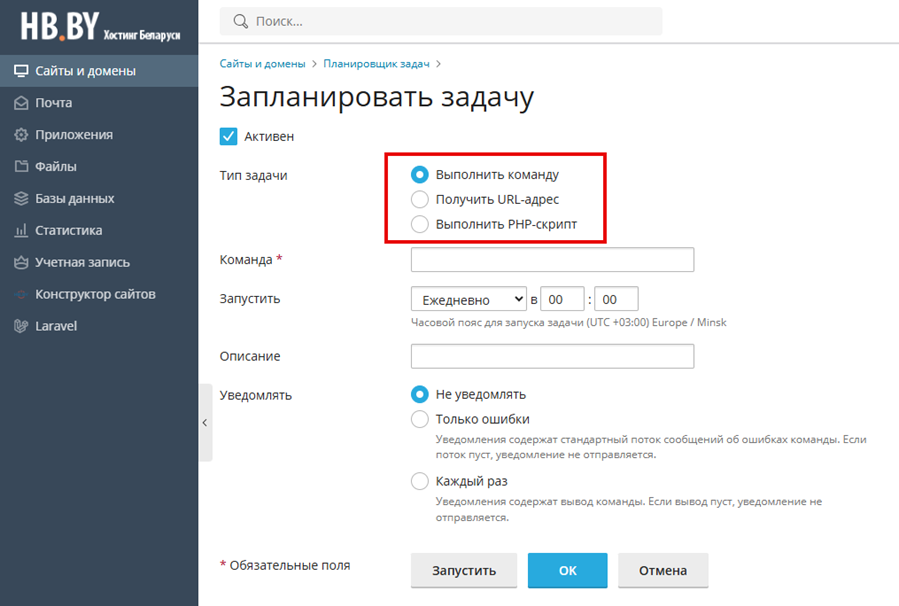 Типы задач в планировщике Plesk
