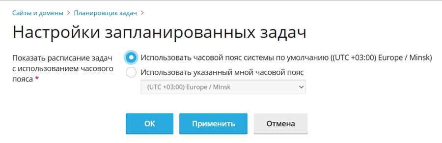 После выбора типа задачи необходимо настроить расписание, то есть определить, как часто и в какое время задача должна запускаться. По умолчанию время указывается в часовом поясе сервера. Если требуется использовать другой часовой пояс, его можно изменить в разделе Сайты и домены → Планировщик задач → Настройки.