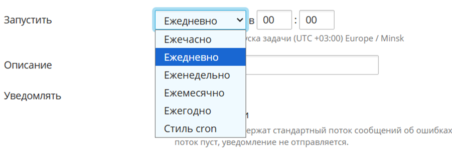 Доступны стандартные варианты периодичности: ежечасно, ежедневно, еженедельно, ежемесячно, ежегодно, а также точная настройка времени запуска через cron-выражения.