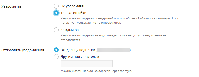 Планировщик Plesk позволяет настроить уведомления о выполнении задач по электронной почте. Доступны три режима: