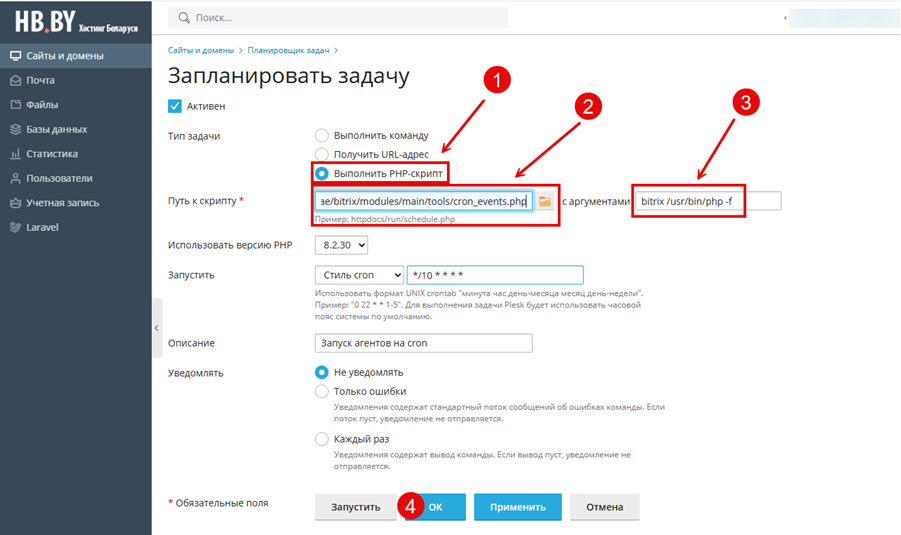 Рекомендуемая периодичность запуска — каждую минуту: это обеспечит своевременное выполнение всех агентов Битрикс, включая отправку почты, обновление курсов валют, генерацию sitemap и прочие автоматические процессы.