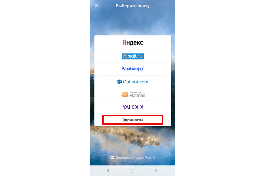 Шаг 2. При первом запуске выберите «Другой почтовый ящик» или, если у вас уже добавлен Яндекс-аккаунт, нажмите на иконку меню (три горизонтальные линии) → «Настройки» → «Добавить аккаунт» → «Другая почта».