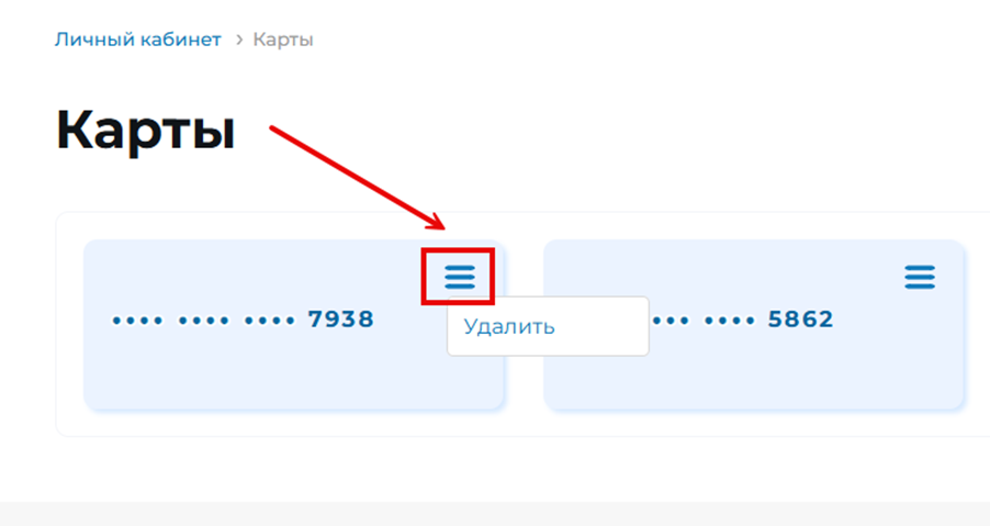 В разделе «Карты» выберите меню в правом верхнем углу той карты, которую хотите отвязать и нажмите «Удалить».