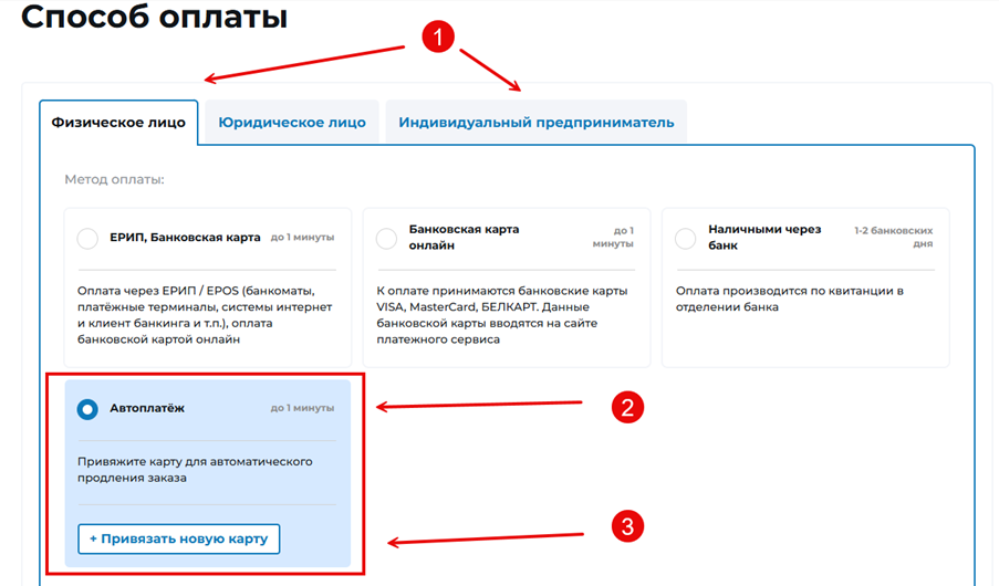 Оформляете заказ → Заполняете контактные данные → Выбираете «Физическое лицо» или «Индивидуальный предприниматель» → Автоплатежи → кнопка «Привязать новую карту» → Подтверждаете заказ.