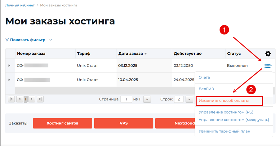 2. Перейдите в раздел «Заказы». Выберите услугу, к которой хотите подключить автоплатёж. Нажмите на иконку в правом верхнем углу таблицы с заказами и выберите «Изменить способ оплаты».